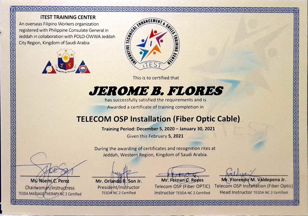 With over seven years of experience, I specialize in OSP fiber installation and FTTH deployment. My expertise includes fiber optic splicing and hands-on work with notable projects at Saudi Telecom Company and DITO Telecom. I possess strong skills in OTDR testing, optical power measurement, and troubleshooting in diverse telecommunications settings.